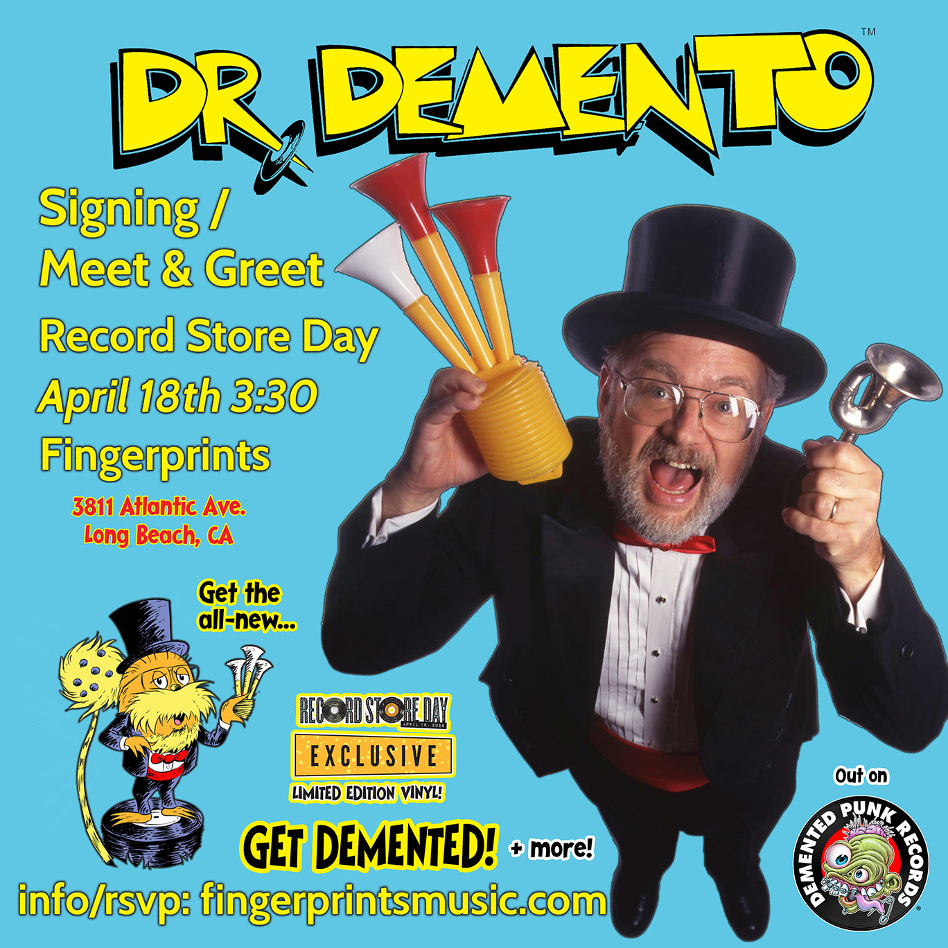 For those on the West Coast, I'll be appearing at Fingerprints Music (3811 Atlantic Ave.) in Long Beach, CA, signing copies of the RSD exclusive "Get Demented" vinyl as well as copies of "Dr. Demento Covered in Punk", starting at 3:30 pm on Saturday, April 18th. All-new "Get Demented" T-shirts & enamel pins (featuring the Seuss-inspired cover art) will also be available at Fingerprints Music, while supplies last. For more info or to RSVP and attend, visit: FingerprintsMusic.com